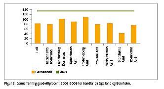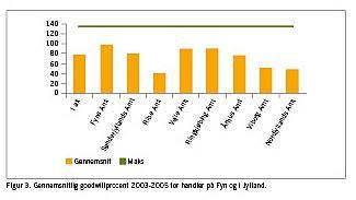 I ti amter er der oplevet et fald fra 2004 til 2005. Københavns Amt, Frederiksborg Amt, Roskilde Amt og Fyns Amt har oplevet en stigning. Men også Viborg Amt og Nordjylland har faktisk oplevet en stigning fra 2004 til 2005, selvom det samlet set udløser et fald i gennemsnittet (Figur 2, 3).
