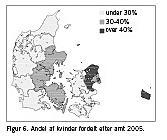 Kvinderne er generelt kommet ind i praksis senere, og det ses i Figur 5, at antallet af kvindelige praktiserende læger er under stærk udvikling. På 25 år er antallet af kvindelige læger steget fra at udgøre 10% til nu at udgøre 35%. Det betyder, at tilgangen til praksis i høj grad består af kvindelige læger. Det er imidlertid værd at hæfte sig ved, at de kvindelige læger ikke er jævnt fordelt over landet. I Figur 6 ses fordelingen af kvindelige praktiserende læger på amter. Der er klart færrest kvindelige læger i de rekrutteringssvage dele af landet og flest i Frederiksborg Amt.