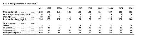 I 2005 er der gennemført 152 handler. Det fremgår af Tabel 2, at der handles mellem 125 og 150 praksis hvert år, og i hele perioden 1997-2004 er der registreret 1.268 handler. I den videre analyse er ikke medtaget handler med anpartsselskaber, da disse handler prissættes på en helt særlig måde. Det samme gælder handler, hvor der er tale om nul goodwill pga. de særlige regler for familiehandler. Disse handler udgør mellem en og fem hvert år. Andre egentlige handler til nul er medtaget i landsgennemsnittet men ikke i de amtslige opgørelser. Antallet af handler er efter disse korrektioner fortsat større end i mange år, nemlig 144, svarende til 23 flere end sidste år.
