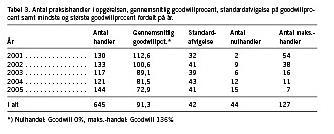 Det fremgår af Tabel 3, at den gennemsnitlige goodwillprocent i 2005 er på 73 mod 82 i 2004, 89 i 2003, 101 i år 2002 og 113 i år 2001.