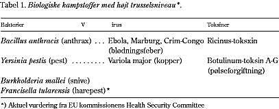 Det aktuelle trusselsniveau hvad angår biologiske angreb rettet mod Danmark er meget lavt. Der er kun relativt få kendte eksempler internationalt på anvendelse af biologiske kampstoffer, men visse stater og terrororganisationer har - eller søger at anskaffe - sådanne våben, og anvendelse mod Danmark kan ikke med sikkerhed udelukkes, ligesom indslæbning af sygdom efter et primært angreb i udlandet er en mulighed. Til at forsvare os mod denne potentielle trussel og sikre politisk handlefrihed - og tryghed også ved trusler, der efterfølgende viser sig at være falske - er der etableret et biologisk beredskab, som i et vist omfang kan håndtere biologiske trusler og angreb. Beredskabet tilpasses løbende ændringer i trusselsbilledet og er endnu under opbygning gennem et tværsektorielt samarbejde, der inddrager mange forskellige aktører og kræver betydelige ressourcer. Beredskabet mod biologiske terrorangreb vil imidlertid også styrke vores muligheder for at håndtere naturlige, biologiske katastrofer og dé epidemiske sygdomsudbrud, f.eks. en ny influenzapandemi, som med stor sikkerhed vil komme på et eller andet tidspunkt.