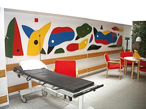 »Det er svært at finde på noget til et sygehus, ikke for opstemmende og ikke for tragisk. Når man så er dømt til at udtrykke sig i farver, er det ikke nemt at få figurer osv. til at holde sit bestemte sted, én ny farve og det hele forrykkes og vesterlandske friheder med former (arme og ben f. eks.) går ikke an med et publikum som syge mennesker, der er følsomme«.