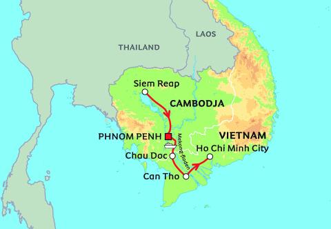 Cambodjas hovedstad Phnom Penh og Mekongdeltaet til Ho Chi Minh City i Vietnam. Undervejs sejler vi på Mekongfloden, cykler langs rismarker i landlige omgivelser og går ud på opdagelse i de mange spændende byer, hvor sporene efter Pol Pots grumme regime og Vietnamkrigen stadig kan skimtes. I Ho Chi Minh besøger vi et hospital og hen mod slutningen af rejsen besøger vi et landsbyhospital på denne rejse, hvor vi gentagne gange kommer tæt på den imødekommende befolkning, når vi besøger lokale markeder, flydende landsbyer og små restauranter.