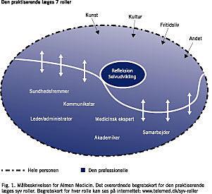 Det overordnede begrebskort er vist på Fig. 1. Det viser at lægen som person rummer både en professionel del og en privat del. Disse to dele af lægen er i evig udveksling. Refleksion og selvudvikling bestemmer hvor stor en del af personen, der udgøres af det private, og hvor stor en del det professionelle fylder. Det professionelle rummer elementer af alle rollerne.