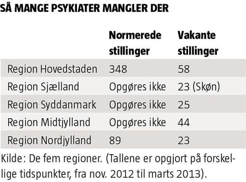 Lægemangel Så mange psykiatere mangler der: 58 i Region Hovedstaden. 44 i Region Midjylland. 25 i Region Syddanmark. 23 i Region Nordjylland.