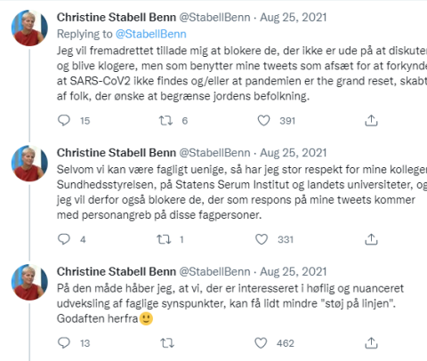 Det ved Christine Stabell Benn godt, og på sin Twitter-profil har hun fastgjort et tweet, hvor hun skriver, at hun vil blokere dem, som benytter hendes tweets som anledning til at angribe hendes kolleger, blandt andet hos myndighederne. For faglig uenighed udelukker ikke gensidig respekt. På samme vis vil hun blokere dem, der misbruger hendes tweets til at postulere, at SARS-CoV-2 ikke findes. Ud med dem.