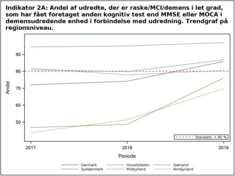 Styregruppen finder det bekymrende, at mange enheder ikke anvender udvidet kognitiv test til afklaring af diagnosen »rask/MCI/let demens«. Dette er bekymrende for både patienter, der får at vide, at de ikke har en demenssygdom, og for patienter, der har MCI eller demens i let grad. Det giver en betydelig risiko for fejldiagnosticering og er ikke god kvalitet. For en del patienter i de tidlige stadier af en demenssygdom og hos patienter uden demenssygdom er der behov for at foretage supplerende undersøgelser. Styregruppen anbefaler, at man i de udredningsenheder, som ikke opfylder indikatoren, ser på intern organisering og planlægning af udredningsforløb, herunder hvilke kognitive tests der anvendes som standard, med henblik på at forbedre kvaliteten i udredningen og den diagnostiske sikkerhed. Styregruppen anbefaler ikke at anvende MoCA eller MMSE til screening for kognitive svigt hos patienter henvist af anden årsag end mistanke om demens.