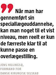 »Når man har gennemført sin speciallægeuddannelse, kan man noget til et vist niveau. Det niveau er udmærket til at bestride en funktion som afdelingslæge, men reelt er kun de færreste klar til at kunne passe en overlægestilling. Derfor har vi inddelt efteruddannelsen sådan, at alle kirurger, der har gennemført uddannelsen, skal have en toårig efteruddannelse inden for en række specielle områder: generel kirurgi, lever-galde-pancreas-kirurgi, spiserørs- og ventrikelkirurgi, kolorektalkirurgi, børnekirurgi og brystkirurgi«, siger Jens Hillingsø.