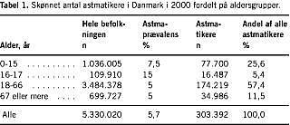 På baggrund af de angivne prævalenser har vi skønnet antallet af astmatikere i Danmark til at være 303.000, hvoraf 226.000 er i aldersgruppen 16 år eller ældre (Tabel 1). Det svarer rimeligt til Keidings estimat på 212.000 astmatikere i den samme aldersgruppe i 1994 [13].