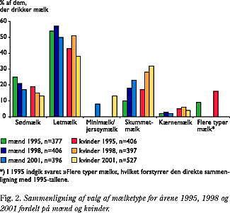 Resultaterne viser, at danskerne drikker lige så ofte mælk nu som i 1998, men at de vælger de magre frem for de fede mælketyper. Skummetmælk og de nye typer mælk med 0,5% fedt (fx minimælk og jerseymælk) vinder frem hos både danske mænd og kvinder og det på bekostning af både letmælk og sødmælk (Fig. 2 ). I 2001 er der således 42% mod 28% i 1998, der drikker de magre mælketyper (skummetmælk, minimælk/jerseymælk og kærnemælk). Letmælk er stadig den mest udbredte mælketype (drikkes af 50% af mændene og 38% af kvinderne), men blandt kvinderne er der sammenlagt flere, som drikker enten skummetmælk, minimælk/jerseymælk eller kærnemælk (49%).