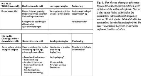 Man bliver først speciallæge i almen medicin, når alle 119 mål er opnået, og man har gennemført de planlagte ansættelser og øvrige moduler i uddannelsen (se senere). Et par eksempler på kompetencer med tilhørende lærings- og evalueringsstrategier fremgår af Fig. 1.