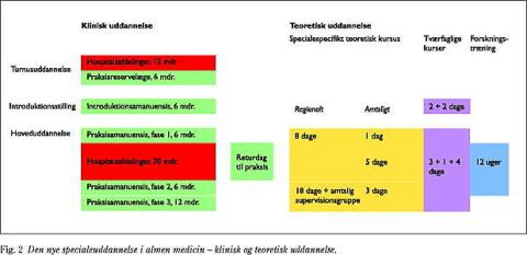 Fig. 2 viser en skematisk oversigt over den nye uddannelse. Uddannelsestiden efter gennemført turnus bliver 5 år (som for langt de fleste øvrige specialer - enkelte får 6-års forløb). Halvdelen af uddannelsen skal fremover være i almen praksis, så der er her tale om en meget markant styrkelse af kernen i vores uddannelse. »Almen medicin læres naturligvis i almen praksis - der, hvor man møder de almenmedicinske problemstillinger«.