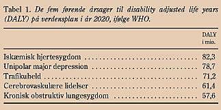 En DALY svarer således til ét tabt år med sundt liv. En internationalt bredt sammensat gruppe af forskere har herefter beregnet DALY for 108 forskellige sygdomme og sorteret sygdommene i rækkefølge efter størrelsen af DALY. På denne liste lå unipolar depression på en fjerdeplads i 1990. I WHO skønner man i en prognose for år 2020, at depressiv sygdom rykker op på en andenplads næst efter hjerte-kar-sygdomme (Tabel 1 ). I tabellen angives det, at unipolar depression på verdensplan skønnes at medføre tab af 78,7 mio. år med sundt liv.