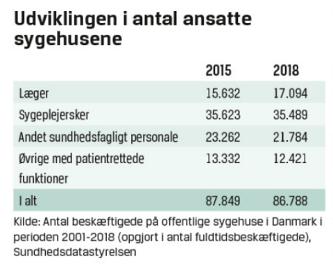 Siden Folketingsvalget i 2015 er der forsvundet 1.061 fuldtidsstillinger med patientrettede funktioner ud af det offentlige sygehusvæsen. En opgørelse fra Sundhedsdatastyrelsen viser, at der ved udgangen af 2018 var 86.788 læger, sygeplejersker, plejepersonale og andre ansatte med patientrettede funktioner på de danske sygehuse. I 2015 var der 87.849.