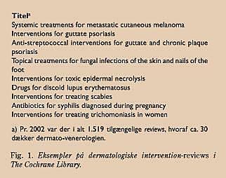 Den evidensbaserede dokumentation af dermato-venerologiske behandlinger svarer til dokumentationen inden for andre specialer. Evidensbaseret medicin (EBM) har to almene aspekter: 1) hjælp til at finde klinisk relevant viden og 2) teknisk ramme for randomiserede kontrollerede studier (RCT). Antallet af dermatologiske reviews i Cochrane-datasen er dog stigende, som udtryk for øget EBM-aktivitet (Fig. 1 ).