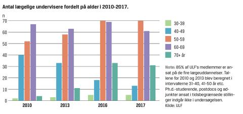 Således viser en nylig opgørelse fra Universitetsansatte Lægers Forening (ULF ), der repræsenter lægelige lektorer og professorer med primæransættelse på universitetet, at 51 procent af medlemmerne er over 60 år, hvoraf hele 17 procent har passeret de 70 år. Samtidig er foreningens medlemsskare i aldersgruppen 40-49 år i perioden 2010-2017 skrumpet fra 25 til 10 procent. En udvikling, der bekymrer ULF’s formand, Helle Hasager Damkier.