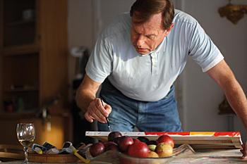 Der går nogle minutter, hvor en strygerkoncert i P2 fylder køkkenet. Hans Boie placerer med forfinede bevægelser gule klatter i midten af de røde kugler. Penslen bliver ført som en dirigents taktstok. Så retter han sig op.