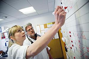 Det er en helt almindelig mandag i Vejle. Alligevel går det i visse tilfælde lidt nemmere at få patienter gennem systemet. Hovedparten af de læger og sygeplejersker, som Ejler og Karen støder på, kender den ledende overlæge. Der stilles eksempelvis færre spørgsmål, når en patient skal flyttes mellem afdelingerne.