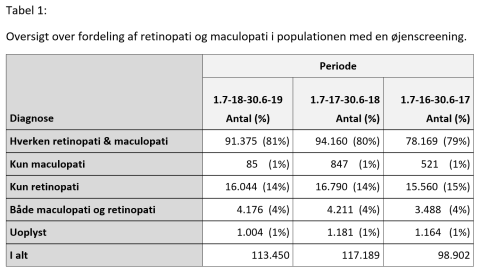 Tabel 1 viser fordelingen af alle grader af retinopati og makulopati i indeværende periode og de foregående to år. Det fremgår således, at 81% af patienter med diabetes i Danmark, undersøgt i indeværende periode, ikke har nogen form for retinopati.