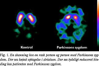 SPECT er en nuklearmedicinsk metode, med hvilken man kan registrere funktionelle forandringer i hjernen ved hjælp af specifikke sporstoffer. Efter i.v. indgift af få mikrogram I-123-mærket sporstof udføres SPECT af hjernen. Ved undersøgelsen kan man visuelt erkende det sted, hvorfra fotonerne emitteres, og bindingen af sporstoffet kan kvantificeres. Det dopaminerge system er det primært ramte ved Parkinsons sygdom. Neurotransmitteren dopamin produceres i hjernestammens substantia nigra, og via lange axoner transporteres dopaminet til hjernens basale ganglier. Ved degenerationen af de dopaminproducerende neuroner bliver den præsynaptiske del af transmissionen, og herunder DAT-receptorerne, påvirket. Antallet af DAT-receptorer er korreleret til antallet af dopaminproducerende neuroner og kan kvantificeres og sammenholdes med referencematerialer. Hos en person med Parkinsons sygdom vil DAT SPECT således vise en reduceret binding af sporstoffet i forhold til en tomografi hos en rask person (Fig. 1 ). Man ved, at antallet af neuroner i substantia nigra skal være reduceret med 50-80%, før man får parkinsonistiske symptomer. Det er derfor ikke overraskende, at der er en stor specificitet af undersøgelsen, idet det vil være sjældent at finde en person med reduceret receptorbinding uden parkinsonsymptomer. Derimod vil man kunne vise forandringer, inden symptomerne opstår, således at denne undersøgelse har et potentiale i forbindelse med screening eller præsymptomatisk diagnostik.