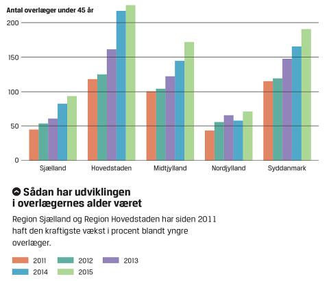 <p>Fra 2007 til 2015 er der kommet to en halv gange så mange yngre overlæger på hospitalerne. Antallet af overlæger under 45 år har nu rundet 750. De yngre overlæger er især 40-44 år gamle, men omkring 150 personer har fået stillingen som overlæge, mens de var i 30´erne. Region Sjælland og Region Hovedstaden har siden 2009 haft den kraftigste vækst blandt yngre overlæger.</p>