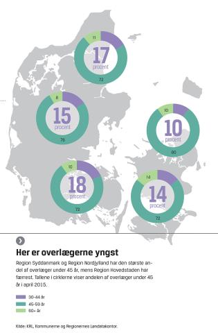 Region Syddanmark og Region Nordjylland har den største andel af overlæger under 45 år, mens Region Hovedstaden har færrest. Tallene i cirklerne viser andelen af overlæger under 45 år i april 2015.