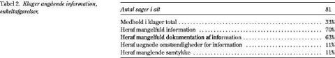 Tabel 2 viser antal klagesager, der er færdigbehandlet og offentliggjort i perioden fra 20/9 1999 til 20/8 2002 under emnerne journalføring, information og samtykke. Der er medtaget klager over mangelfuld eller ingen information og manglende dokumentation af information. Tallene er opgivet for enkeltafgørelser, dvs. at en enkelt sag kan indeholde flere afgørelser.
