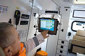 I ambulancen hænger en berøringsfølsom skærm, og redderne trykker nu relevante informationer ind, mens de følger med på en skærm i akutmodtagelsen. Her får de meldinger om tilstand og behandling på skadestedet og under transporten, og der kommer løbende nye data om puls og blodtryk.