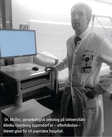 Nu står Müller ved den mobile pc, der rummer alle mulighederne, som hospitalets avancerede digitale niveau tilbyder. Den mobile pc er det fysiske udtryk for omorganiseringen, og det er her, lægerne ved »et enkelt klik« ikke bare er på patientens journal, men også har adgang til en lang række andre data. Det er en såkaldt integreret elektronisk patientjournal, hvor en platform med fokus på patientforløb er integreret med en arkiveringsplatform.