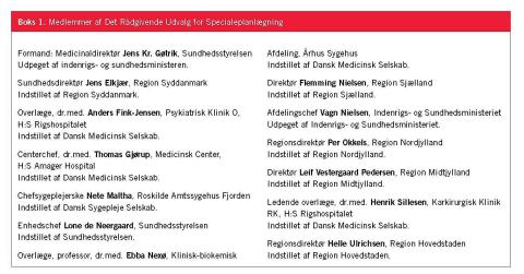 Sundhedsstyrelsen nedsatte i overensstemmelse med sundhedsloven et rådgivende udvalg for specialeplanlægning i begyndelsen af 2006. Udvalgets medlemmer og sammensætning fremgår af Boks 1. Udvalgets opgave er at drøfte det faglige grundlag for specialeplanlægning og udarbejde oplæg til Sundhedsstyrelsen herom.