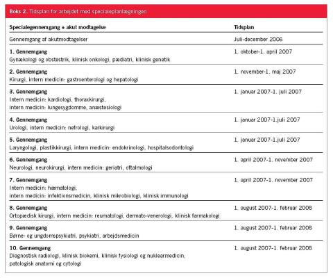 Som det fremgår af den fastlagte tidsplan (Boks 2) er der planlagt i alt ti specialegennemgange af i alt 36 specialer - hver af seks måneders varighed. Resultaterne for de enkelte specialer udmeldes efterhånden, som de foreligger. Den nugældende specialevejledning, og herunder den nuværende placering af lands- og landsdelsfunktioner, er gældende, indtil der meldes nye rammer ud for det enkelte speciale.
