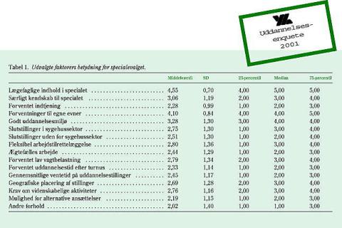 I uddannelsesenquetens temasektion er deltagerne blevet bedt om at besvare spørgsmålet: »Hvilke faktorer var vigtige i dit specialevalg?«, herefter følger 16 spørgsmål som besvares med en talkode: 5 = meget vigtigt, 4 = vigtigt, 3 = mindre vigtigt, 2 = ikke vigtigt, 1 = ved ikke/indgik ikke i overvejelserne.