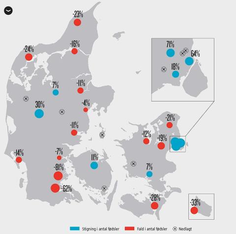 Det lavere fødselstal skyldes især, at de små årgange føder, men Karen Reinhold Wøjdemann tror ikke, at færre fødsler kommer til at koste mange lægejob. Der er grænser for, hvad man kan skære i døgnbemandingen. Centraliseringen af fødsler på store hospitaler betyder mere for lægernes arbejdsvilkår, fordi der ikke altid følger personale med. ”Der er behov for elastik på afdelingerne, og den bliver nogle gange strakt for langt, så man bliver nødt til at flytte kvinder i fødsel”, siger hun.