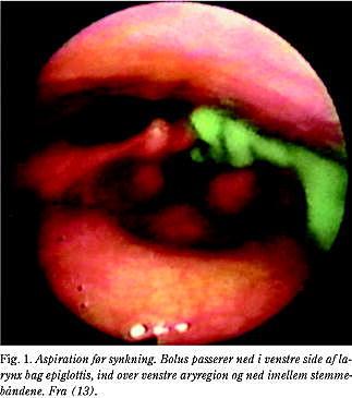 Fiberoptisk endoskopisk evaluering af synkefunktionen (FEES) med sensorisk testning (FEESST) anvendes til diagnostik af aspiration og til vurdering af synkefunktionen og evnen til at beskytte luftvejene. Samtidig giver undersøgelsen mulighed for at afprøve terapeutiske tiltag, f.eks. hvilken føde og væske patienten er i stand til at indtage. Man kan således afgøre, om det overhovedet er forsvarligt med oral føde-/væskeindtagelse, og hvorledes patienten sikres sufficient ernæring. Endelig giver undersøgelsen information om stemmebånd og stemmekvalitet. Udstyrets indretning muliggør undersøgelse på sengestuer og er ikke behæftet med større ubehag eller risici for patienten. FEES er en standardiseret test og indebærer indførelse af et lille fiberoptisk endoskop gennem næsen ned til svælget. Hermed kan man visuelt erkende stemmebånd, strubelåg og øsofagusmund i forbindelse med dels synkning af væske/føde, dels stemmedannelse (Fig. 1 ). Resultaterne lagres på cd-rom mhp. undervisning/instruktion af personale og/eller patienten og dennes familie. Undersøgelsen kan udvides med FEESST med anvendelse af et specielt endoskop til applikation af varierende lufttryk i svælget. Luften udgør det sensoriske stimulus og hermed undersøges larynxrefleksen.