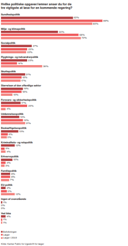 Valget i 2019 fik logisk nok prædikatet »Klimavalget« på grund af det store fokus på klimaforandringer og global opvarmning. Også lægerne havde i målingen forud for valget i 2019 klimaet højt på dagsordenen, men dengang som nu er sundhedspolitikken det afgørende politikområde for lægevælgerne. I 2022 er den prioritering blevet skærpet yderligere: