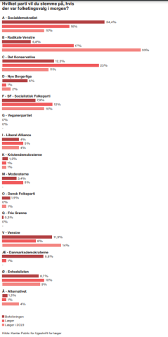 Mens den måling, Kantar Public foretog forud for juni-valget i 2019, viste, at så mange som hver tredje læge – 33 procent – ville stemme på Radikale Venstre, er det forud for det kommende valg Det Konservative Folkeparti, der er det langt største parti blandt de adspurgte 939 læger i undersøgelsen. 23,2 procent af dem vil stemme konservativt – det er en fremgang på næsten 11 procent i forhold til den tilsvarende måling i 2019. Antallet af Radikalt-orienterede læger er samtidig næsten halveret og står nu til at udgøre 17 procent af læge-vælgerskaren.
