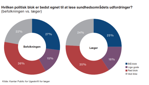 Det betyder, at »rød blok« ved en simpel sammentælling af procenttallene i målingen i lægepanelet kan mønstre 56 procent af lægestemmerne, og »blå blok« står til 49 procent, mens Lars Løkke Rasmussens selverklærede midterparti Moderaterne står med de sidste 5 procent.
