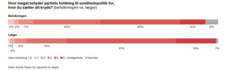 Mens der altså også ved dette valg er et sammenfald mellem de to højest prioriterede politikområder blandt lægerne og den samlede befolkning, så er der andre spørgsmål, der ligesom i tidligere målinger viser meget markante meningsforskelle.
