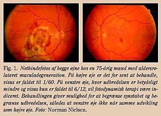 I Danmark indførte vi for tre år siden fotodynamisk terapi til behandling af den eksudative form for AMD. Behandlingen er en totrinsbehandling, hvor der først indgives et fotosensibiliserende stof i.v. (verteporfin), og efterfølgende belyses retina med en nontermisk laser, hvorved det fotosensibiliserende stof aktiveres og bliver cytotoksisk. Behandlingen har til formål at lukke den subfoveale neovaskularisation uden at skade retina. Det fotosensibiliserende stof bindes til low density lipoprotein (LDL)-molekylerne i blodet, og da den subretinale neovaskularisation har øget antal LDL-receptorer, ophobes det fotosensibiliserende stof her, og det er muligt at foretage en selektiv behandling med kun lille påvirkning af retina og dens kar. Okklusionen af den neovaskulære membran er kun temporær, og 4-12 uger efter behandlingen vil karrene i den neovaskulære membran åbne sig igen. Behandlingen skal derfor normalt gentages hver tredje måned til at starte med, og efter 1-2 år med længere interval.