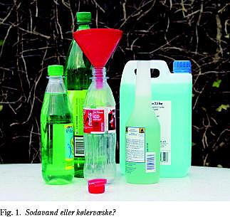 Fælles for gruppen af omhældningsulykker er, at advarselssignalerne er fjernet. Man drikker derfor typisk af tørst og ikke af nysgerrighed. Eksponeringen bliver derfor ofte betydelig større, når det giftige stof opbevares i en sodavandsflaske, giftvirkningen bliver derved tilsvarende større. Det er Giftinformationens erfaring, at et lille barn, som i nysgerrighed undersøger et giftstof i den oprindelige beholder, vil kunne identificere produktet som værende mindre indbydende og dermed ikke forbinde det med almindelige mad- eller drikkevarer. Hvis det lykkes for barnet at åbne børnesikringsmekanismen, vil det normalt kun forsøge sig med en lille slurk, som oftest spyttes ud igen. Barnet indtager på denne måde mindre, ofte ubetydelige mængder af giftstoffet. I modsætning hertil indbyder en sodavandsflaske til at drikke væsken. Et typisk eksempel er en rest kølervæske, som omhældes til en flaske fra den oprindelige dunk med en børnesikret kapsel. Kølervæske har ofte en indbydende blå farve og kan let forveksles med en læskedrik, når den opbevares i en sodavandsflaske (Fig. 1). Da det samtidig smager sødt, kan der let indtages så meget, at kroppen udsættes for en toksisk dosis.