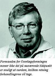 Formanden for Overlægeforeningen, Steen Tinning (Fig. 1 ), mener ikke, det på nuværende tidspunkt er muligt at vurdere, hvilken retning forhandlingerne vil tage, eller hvor eventuelle særlige vanskeligheder på de generelle og specielle områder kan ligge. Han bemærker dog, at der tilsyneladende er et vist pres for at få forhandlingerne hurtigt afsluttet. Om det omsættes til praktiske resultater, kan ikke vurderes på nuværende tidspunkt (den 21. januar 2002).
