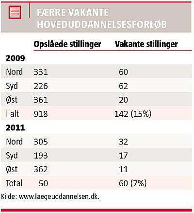 I 2009 var der 15 pct. vakante hoveduddannelsesforløb på landsplan. Sidste år var det faldet til blot syv procent - og halvdelen af disse forløb i almen medicin og psykiatri.