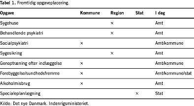 Behandlingen af psykisk sygdom, herunder distriktspsykiatrien vil, hvis oplægget »Det nye Danmark« bliver vedtaget, komme til at ligge i fem regioner sammen med det somatiske sygehusvæsen samt sygesikring og praktiserende læger. Socialpsykiatrien derimod vil lande i det brogede puslespil af storkommuner eller kommunale samarbejder.