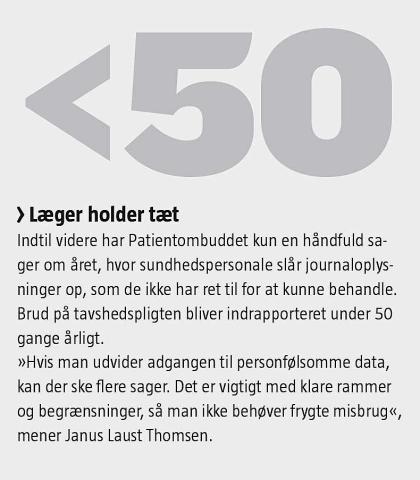 Indtil videre har Patientombuddet kun en håndfuld sager om året, hvor sundhedspersonale slår journaloplysninger op, som de ikke har ret til for at kunne behandle. Brud på tavshedspligten bliver indrapporteret under 50 gange årligt.