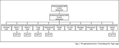 Yngre Læger i Frederiksborg Amt besluttede at matche arbejdsgiverne. Det betød, at de gamle reservelægeråd, som var knyttet til det enkelte sygehus, blev nedlagt. I stedet oprettede vi de nye funktionsenhedstillidsrepræsentanter, som samledes i et nyt Funktionsenhedsreservelægeråd. I det omfang en funktionsenhed var spredt over flere adresser, blev der til hver enkelt adresse knyttet en lokal tillidsmand (se Figur 1 ).