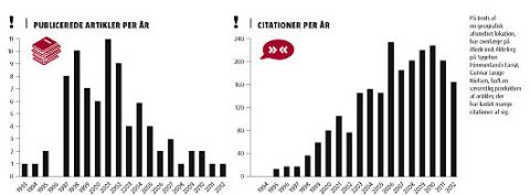 Men den afsondrede lokalitet har ikke afholdt overlæge på Medicinsk Afdeling Gunnar Lauge Nielsen fra at have en forskerkarriere her. Oven i købet en, der har kastet både omtale og citationer i massevis af sig (se grafer) i både ind- og udland som resultat af det arbejde, han enten har stået for alene eller i samarbejde med andre forskere.