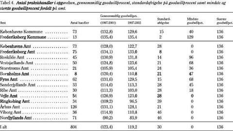 Det fremgår af Tabel 3 , at den gennemsnitlige goodwillprocent i 2002 er på 98 mod 112 i år 2001 og 130 i år 1997. Der er derfor tale om en fortsat faldende tendens, men med en stigende standardafvigelse. I gennemsnit er procenten faldet 6-7% p.a. i de sidste pr. år. Der er et lidt større fald pr. år i slutningen af perioden end i begyndelsen af perioden og faldet er yderligere øget fra 2001 til 2002. Det fremgår også, at der i såvel 2001 som 2002 har været handlet et par praksis til 0 i goodwill, og det trækker gennemsnittet meget ned. Standardafvigelsen er samtidig stigende, og det er et udtryk for, at spredningen i goodwillprocenterne er blevet betydeligt større i de forskellige amter. I 2002 er der dog tale om, at der i otte amter slet ikke er registreret handler på 136%, men kun på lidt lavere niveau. I 2001 var det kun i få amter, at der ikke havde været handlet til 136%.