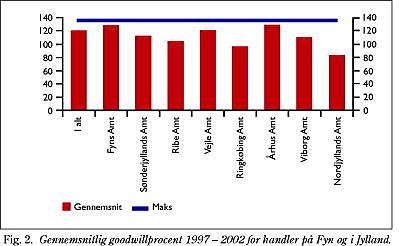 I Tabel 4 samt i Fig. 1 og Fig. 2 er udviklingen fordelt på amter, og de viser, at der er et ret ensartet geografisk mønster over årene. De højeste goodwillgennemsnit findes fortsat i amter med universitetsbyer. På Sjælland findes den største ensartethed, idet Frederiksberg Kommune, Frederiksborg Amt og Roskilde Amt alle ligger over 130%. Endvidere ligger Københavns Kommune, Århus Amt og Fyns Amt meget tæt på 130%.