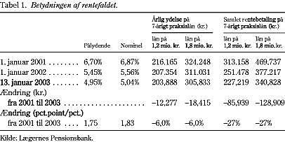 Renteniveauet har også stor betydning for køberens økonomi. Siden vedtagelsen af loftet på de 136% har renteniveauet generelt været faldende. Praksislån fås i en række banker til konkurrencedygtige vilkår, da praksislån anses for at være relativt sikre lån. Lægernes Pensionsbank yder p.t. lån til at finansiere goodwill, driftsmidler og restfinansiering til en rente på 4,45% (pr. 13.3.2003). Sidste år ved samme tid var renteniveauet 5,45% og for to år siden 6,70%. Det historisk lave renteniveau har derfor også betydning for økonomien i en praksishandel. Lægernes Pensionsbank har beregnet hvad rentefaldet fra 2001 til nu har betydet for den årlige ydelse og for den samlede rentebetaling. Det fremgår, at den årlige ydelse er faldet 18.000 kr. på et lån på 1,8 mio. kr., der afdrages over 7 år (lig med afskrivningsperioden). Den samlede rentebetaling over lånets løbetid er faldet med 129.000 kr. for et lån på 1,8 mio.kr. svarende til en reduktion i den samlede rentebetaling på 27% på de to år (se Tabel 1 ).