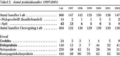 Det fremgår også af tabellen, at der i 2002 er handlet 41 delepraksis. Det svarer til, at ca. en tredjedel af handlerne finder sted i forbindelse med etableret eller handlet delepraksis. Delepraksis er blevet en populær praksisform. Meget tyder på, at delepraksisadgangen har trukket en hel del læger til almen praksis. Vi ved dog ikke, hvad disse læger havde valgt, hvis delepraksisformen ikke havde været mulig.